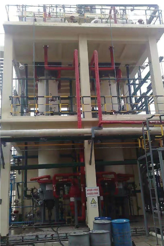 氯气与氢气反应生成氯化氢时,释放出大量反应热,完全可以用来副产蒸汽。公司开发出全自控副产0.3-0.5MPa蒸汽氯化氢合成装置,氯化氢合成炉从上到下由冷却段、副产蒸汽段和合成段三部分组成。合成炉副产蒸汽段位于高温区段,采用全石墨炉筒或钢制水冷壁炉筒;在合成段顶部和底部钢材容易受腐蚀的区段,采用石墨材料制作;既克服了石墨炉筒强度低和使用温度受限制的缺点,又克服了合成段和冷却段容易腐蚀的缺点。该装置全自动DCS控制,远程自动点火,氢气和氯气自动配比控制,制酸自动控制,具有多种安全连锁保护系统;在保证正常工艺操作条件的情况下,能保持长时间稳定的运行,企业可按正常的检修计划作业,避免了非正常的停车检修,为企业节省了大量的检修费用和非正常停车所造成的损失。